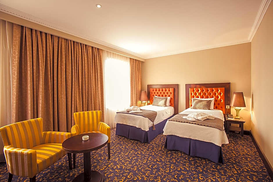 Room options span a wide spectrum, from the compact Economy on the Groundfloor to expansive suites. The Economy, Groundfloor offers 194 square feet with two twin beds and a double bed, ideal for 2 adults and 1 child. The 431-square-foot Suite features a double bed plus a sofa bed for larger groups, and the Presidential Suite accommodates up to 8 adults and 5 children. For families, the Superior, Triple at 269 square feet includes a twin and a queen, while Premium, King sleeps 4 adults and 3 children with a king bed; several other configurations, including Deluxe with two twins and a double or city-view options, round out the lineup.